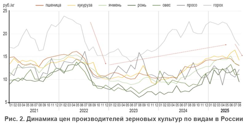 График, представленный на рис. 2, иллюстрирует, что тенденция изменения цен производителей на зерновые и масличные культуры (основного компонента для производства кормов) во многом схожа с динамикой ценовых предложений комбикормовых предприятий. Так, после резкого снижения расценок на зерновые культуры летом 2022-го наблюдается тенденция к росту до лета 2025 года.