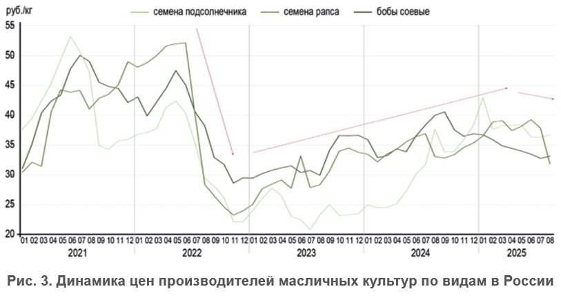 Динамика цен производителей масличных культур по видам в России