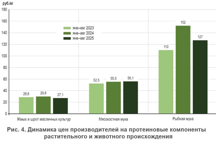 За январь–август 2025 года средние цены производителей на все виды комбикормов увеличились на 13% относительно аналогичного периода прошлого года и достигли 26,0 руб./кг.